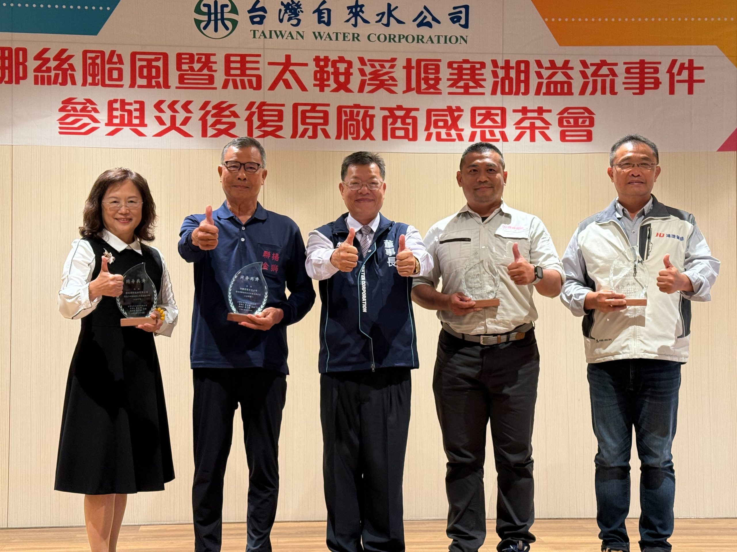 台灣自來水公司今(23)日舉行災後復原協力廠商表揚典禮,公開表揚在丹娜絲颱風台南風災屋頂修繕協力廠商及花蓮縣馬太鞍溪堰塞湖溢流事件協助復水廠商,積極投入災後復原作業,肯定其貢獻與專業投入。